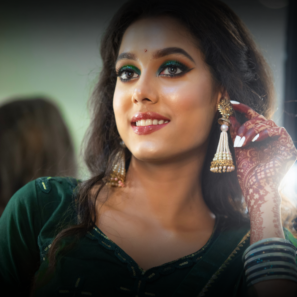 These colorful rituals deserve makeup that’s fresh, vibrant, and effortlessly beautiful. At Muskan Glam Studio, we bring a soft, radiant charm to your Haldi and Mehndi makeup, designed to keep you glowing under the sun and camera flash alike. Our approach focuses on breathable, skin-friendly products that provide light coverage with a dewy finish. Think fresh florals, subtle shimmer, and flawless skin that glows from within. Perfect for pre-wedding joy and candid moments, we also style hair with floral accessories and ensure your entire look feels festive yet comfortable.
